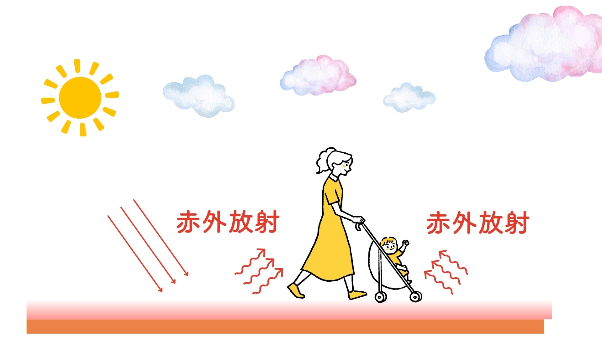 気象観測では通常、1.2m〜1.5m地点での気温を計測します。子どもはそれよりも低い地点で、地面からの赤外放射を受けるため、注意が必要です。たとえば、気象観測の気温が32.3℃のとき、幼児の身長では35℃を超える気温となります。