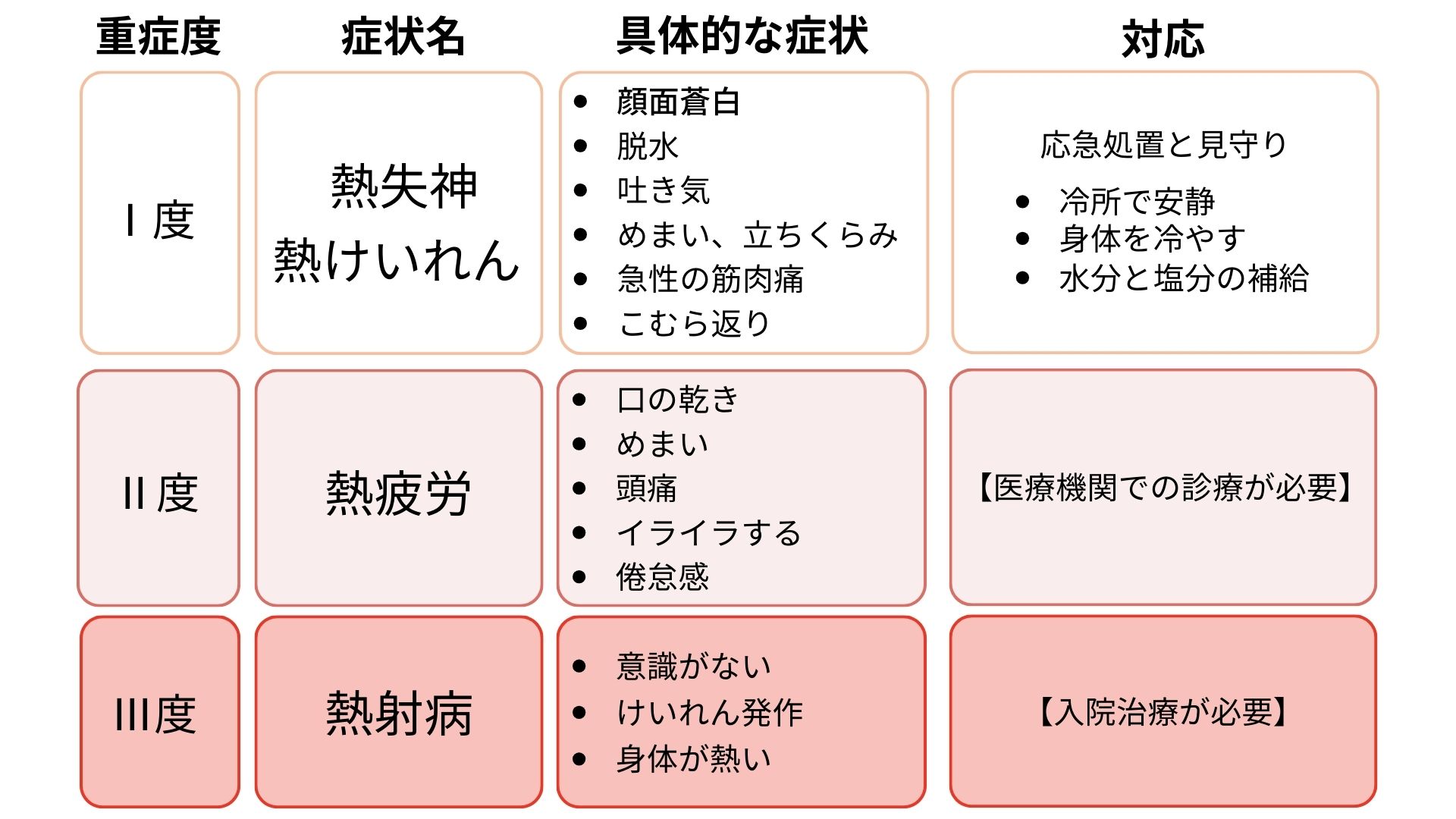熱中症とは、「暑くて湿気の多い場所に長くいることで、体の中に熱がたまり、うまく体温を下げられなくなってしまう状態」を指します。熱中症はその重症度によってⅠ度の軽症、Ⅱ度の中等症、Ⅲ度の重症の3段階に分けることができ、段階ごとに必要な治療や対応が異なります。