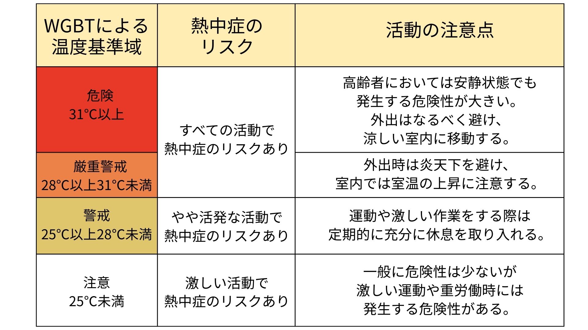 ※暑さ指数(WBGT)とは、熱中症リスクを判断する数値です。気温、湿度、日射・輻射(赤外放射)、風の要素をもとに算出します。暑さ指数をもとにした、熱中症のリスクと活動の注意点は、以下のとおりです。
