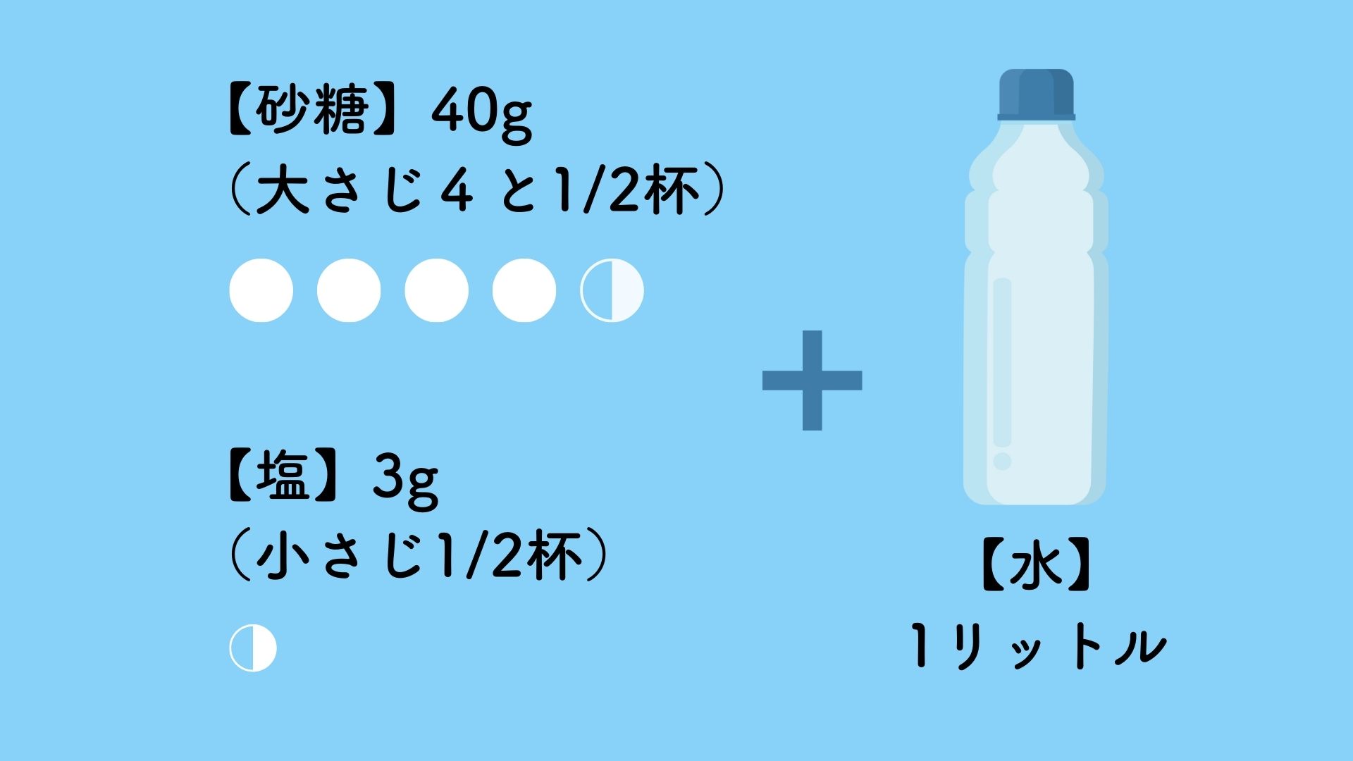 1リットルの水に、砂糖40gと塩3gを入れて混ぜながら溶かす。お好みでレモンなどの柑橘果汁を入れてもよい。