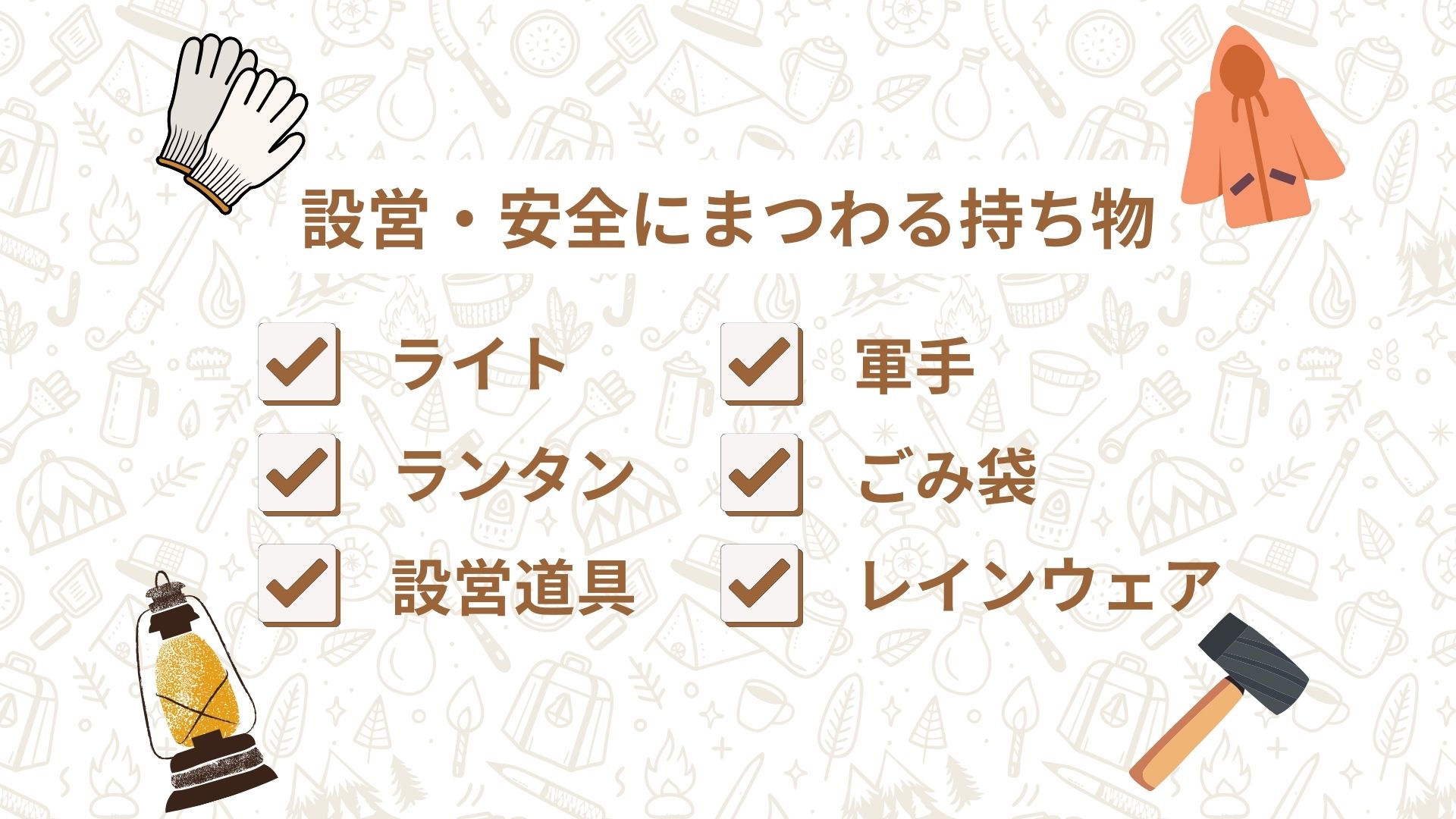 以下で紹介する持ち物は、季節を問わずキャンプには欠かせないアイテムです。