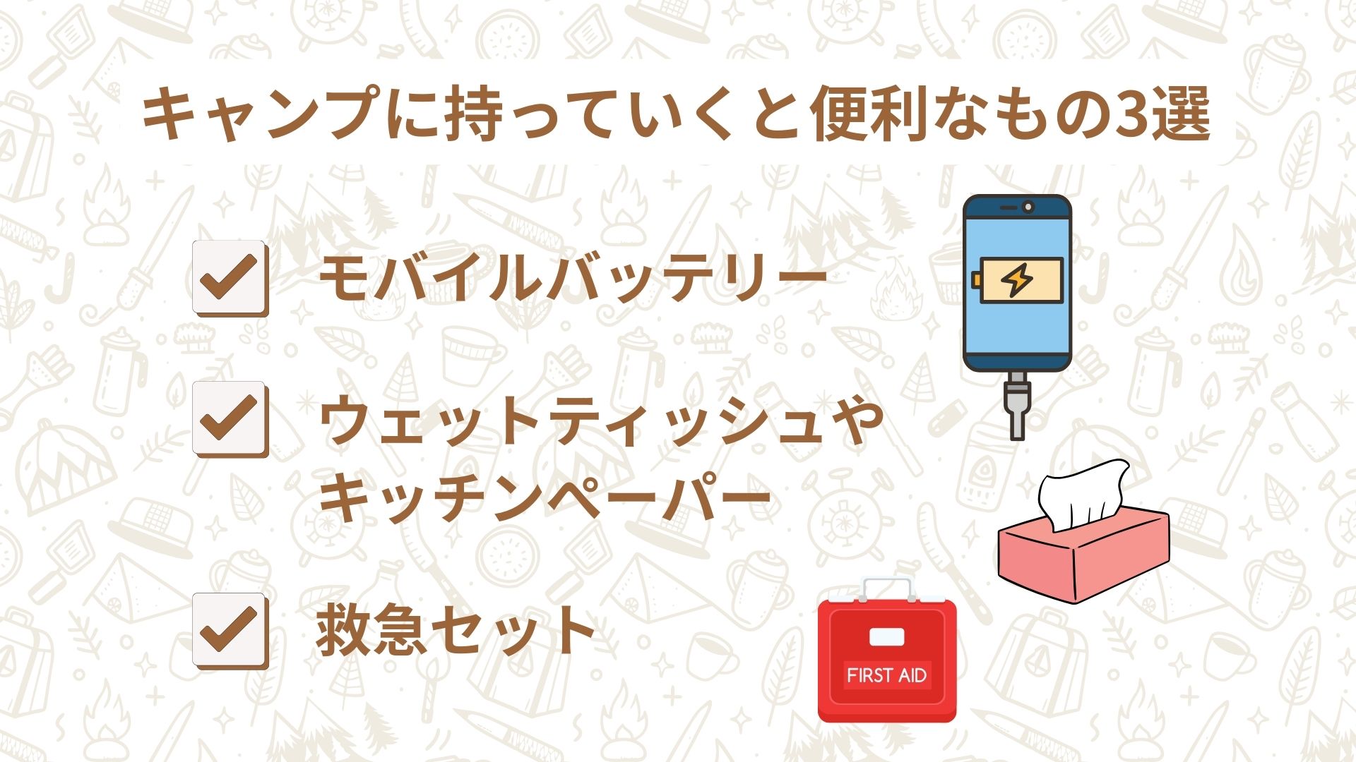 続いては、キャンプに持っていくと便利なものを3点紹介します。