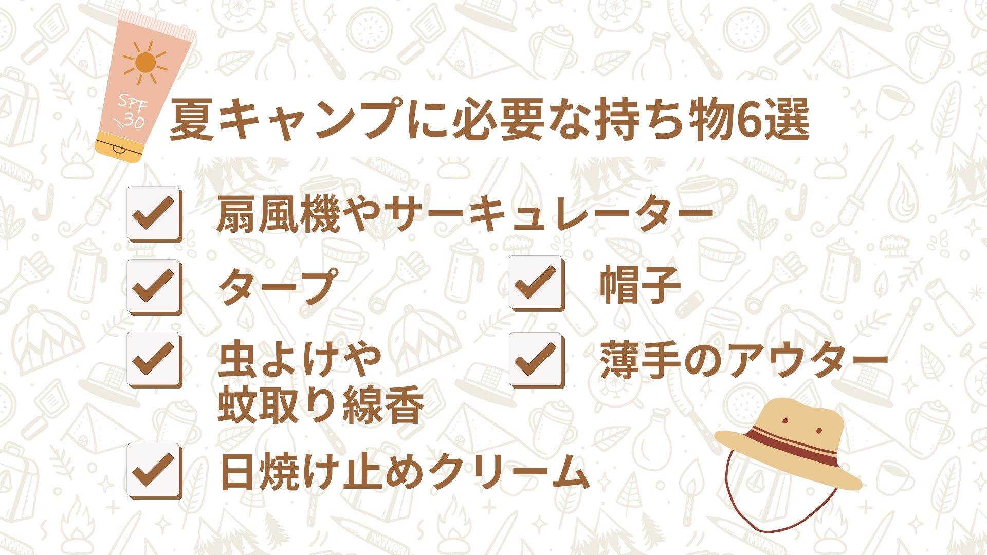 ここからは、夏キャンプに必要な持ち物を6点紹介します。日差しや虫よけ対策を行い、快適にキャンプを楽しみましょう。