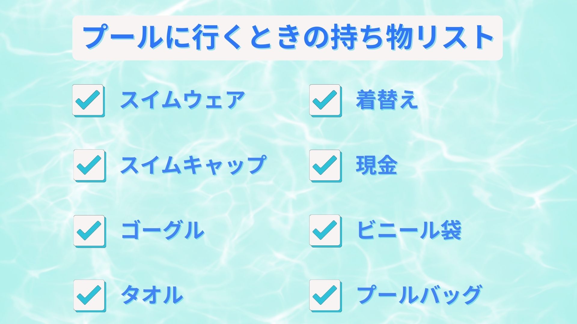 プールに行くときに必須の持ち物を紹介します。ただし、プールには屋内・屋外などさまざまな種類があり、施設ごとに持ち込めるアイテムも異なります。事前にルールを確認しておきましょう。