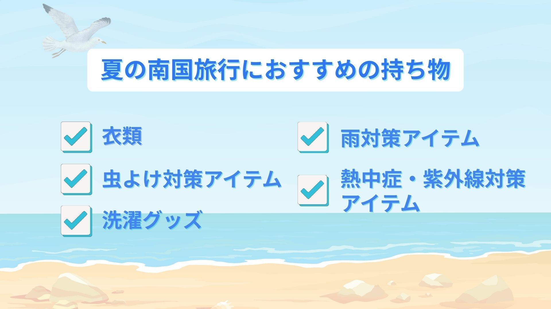 夏の南国旅行では、高温多湿な気候や強い日差しへの備えが重要です。快適な衣類に加え、虫よけや紫外線対策も用意しておきましょう。さらに、天気が急変する場合もあるため、雨対策のグッズもあると便利です。旅先の環境に合った持ち物が、より楽しい旅行にしてくれるでしょう。ここでは、夏の南国旅行におすすめの持ち物を紹介します。
